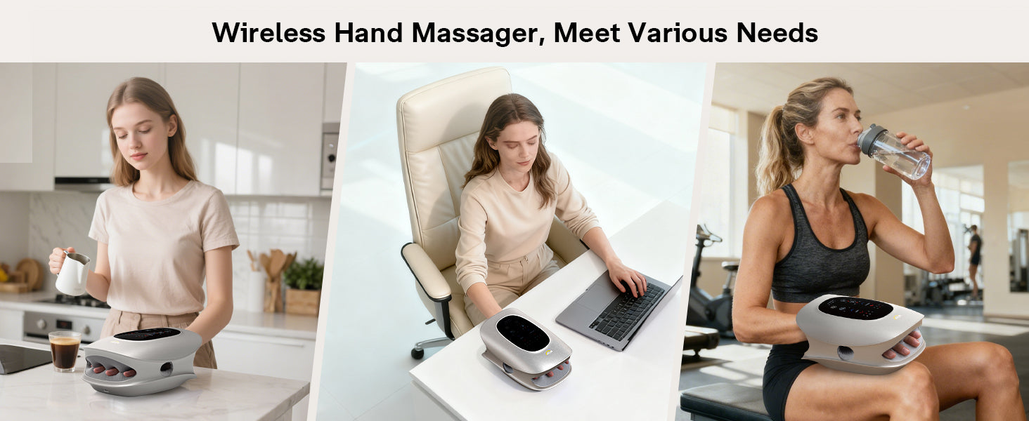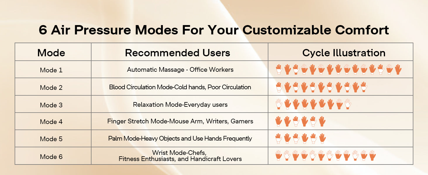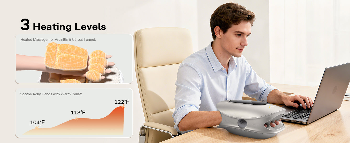 • Soothing Heat Therapy: This hand massager offers 3 levels adjustable temperature settings (104°F - 122°F) for soothing warmth that's carefully calibrated to penetrate deep into muscles and joints. The heat massage function promotes relaxation, relieves tension, and enhances the overall massage experience, making it ideal for those experiencing hand overuse, joint pain, or cold hands