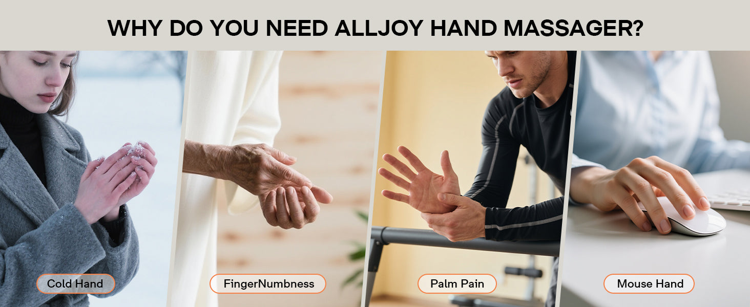 • Unique Finger Stretching and All-Around Hand Massage:The ALLJOY hand massager utilizes innovative finger stretching and full-palm airbag massage technology, gently stretching each finger while providing full-palm pressure massage. This fully relaxes the fingers, back of the hand, wrist, and palm. Precision pressure on key acupuncture points effectively relieves hand stiffness, arthritis pain, and carpal tunnel syndrome. Designed for office workers, homemakers, athletes, gamers, and those who regularly work with their hands